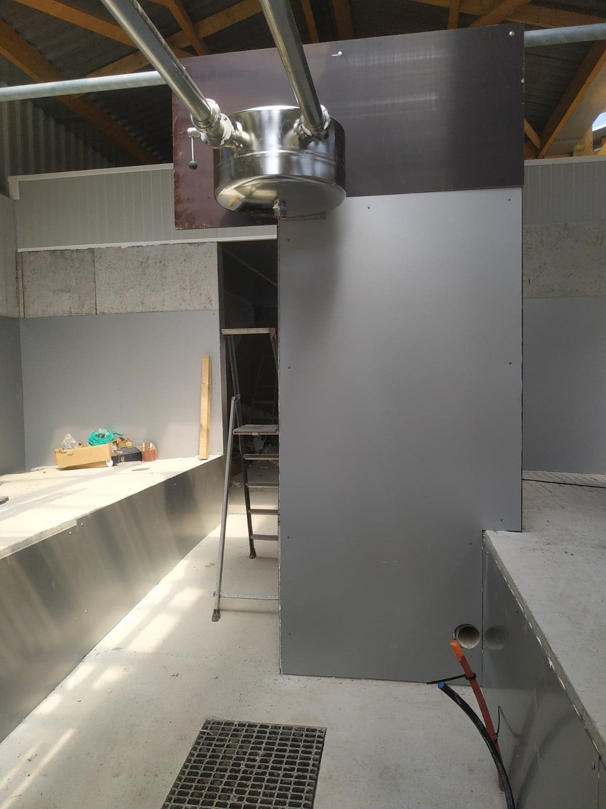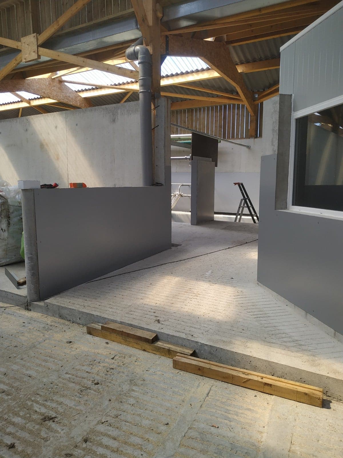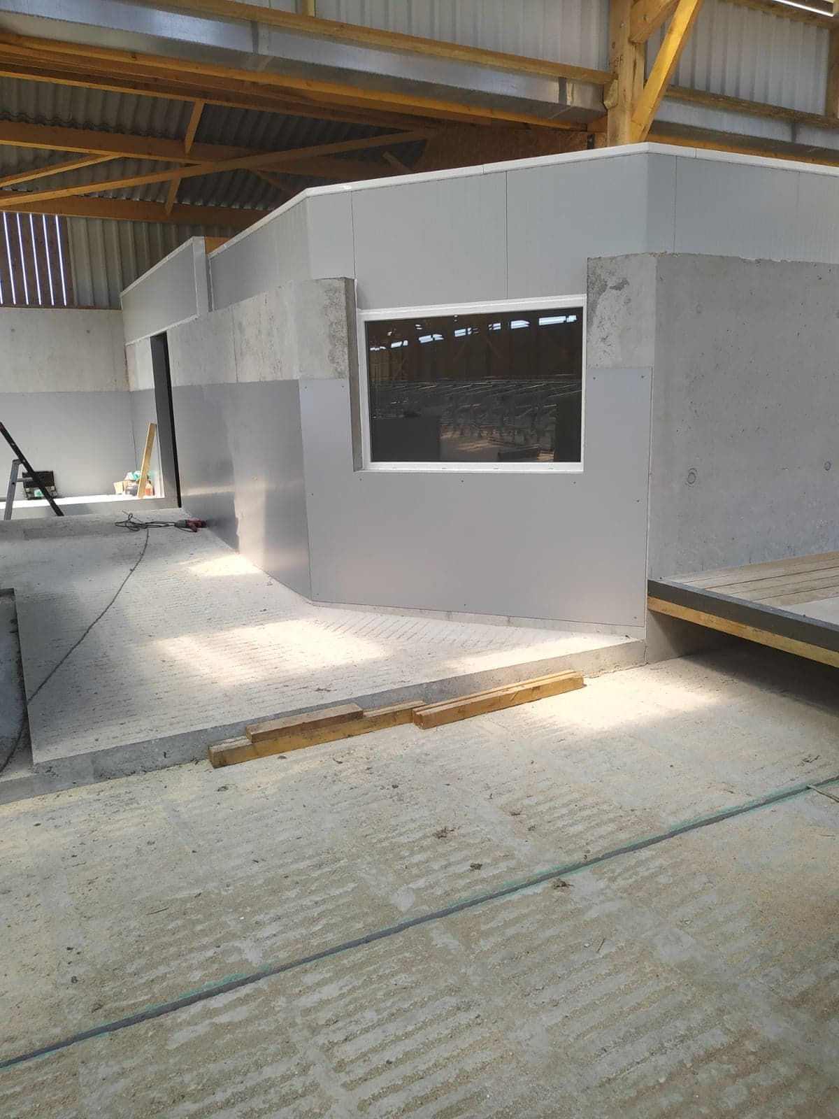 La pose de panneaux Alu DILITE permet que le nettoyage de la salle de traite soit plus facile. Les panneaux sont collés et rivetés au mur.
