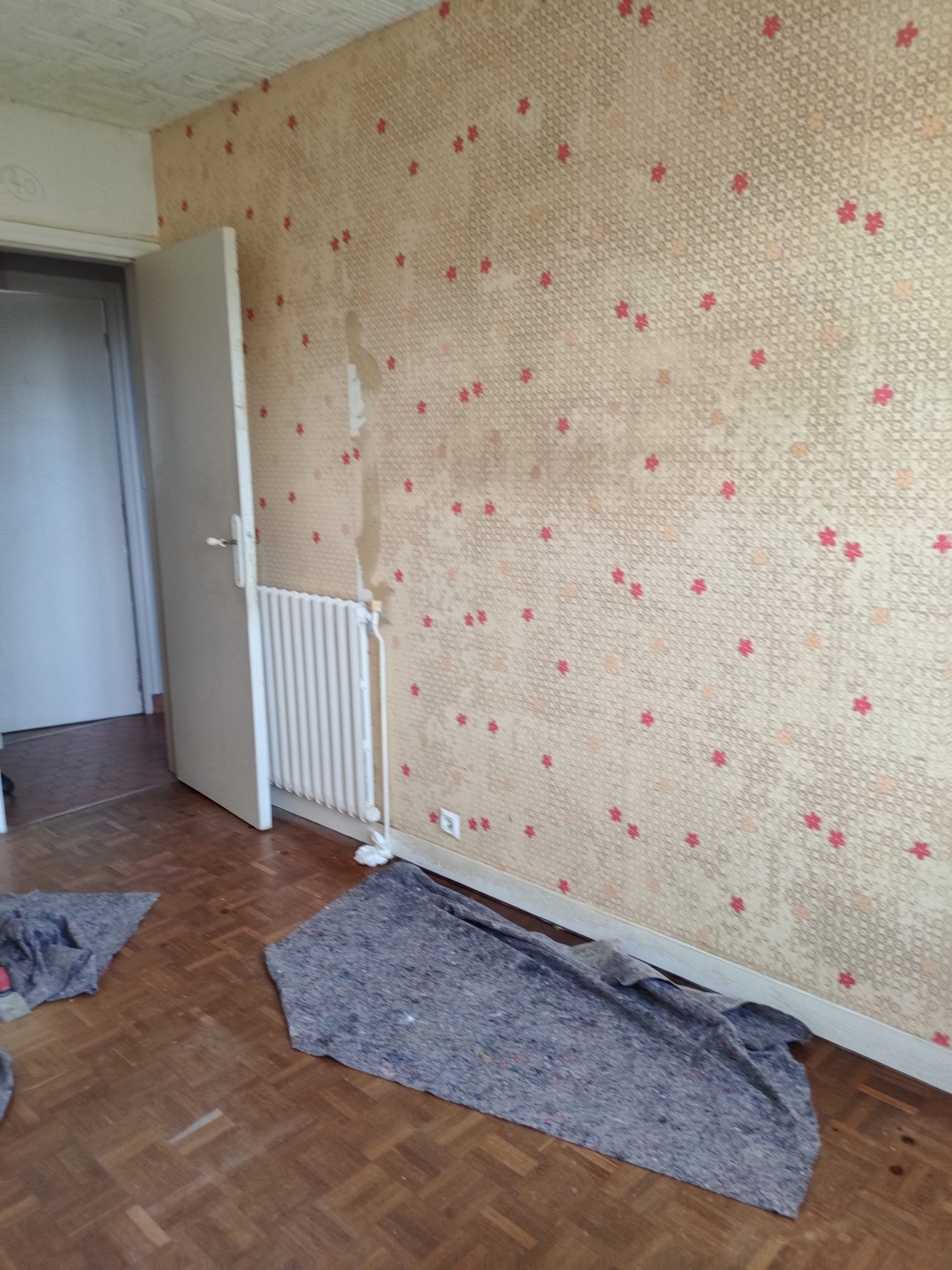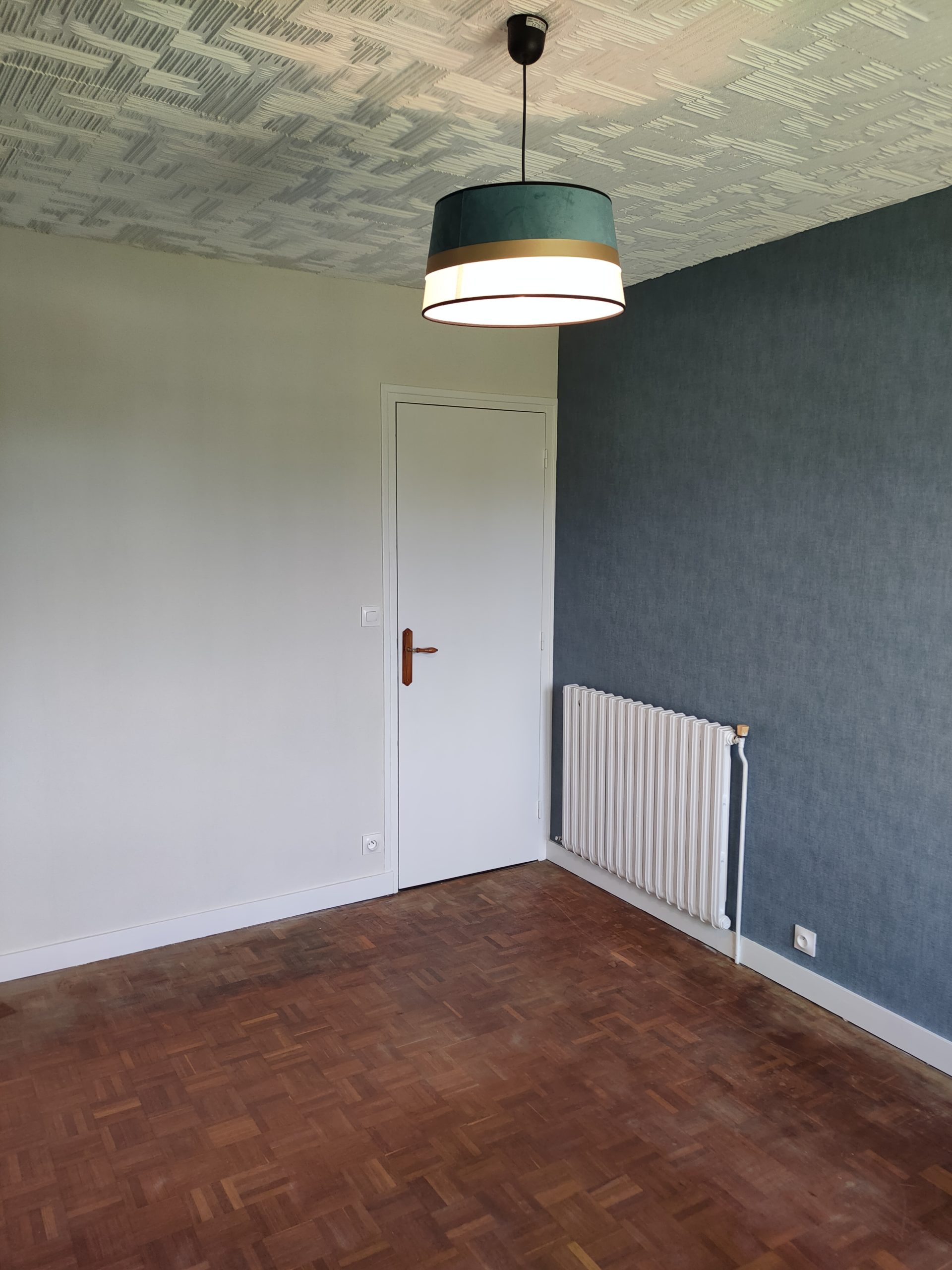 Tapisserie d’une chambre en deux ton, peinture sur plaque plafond ainsi que les plinthes, la porte et le radiateur.